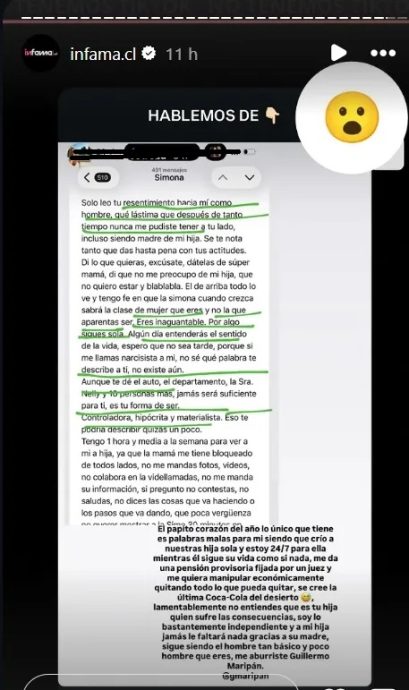 En un mensaje posterior, cerró con duras palabras hacia el jugador: «Lamentablemente, no entiendes que es tu hija quien sufre las consecuencias, soy lo bastante independiente y a mi hija jamás le faltará nada gracias a su madre. Sigue siendo el hombre tan básico y poco hombre que eres, me aburriste Guillermo Maripán».