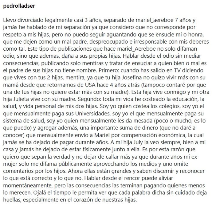El exmodelo comenzó señalando el tiempo que lleva separado de Aereboe: «Llevo divorciado legalmente casi 3 años, separado de Mariel Aereboe 7 años y jamás he hablado de mi separación ya que considero que no corresponde por respeto a mis hijas, pero no puedo seguir aguantando que se ensucie mi honra, que me dejen como un mal padre, despreocupado e irresponsable con mis deberes como tal».