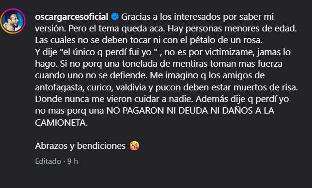 Tras varios días de intercambio de declaraciones, Óscar Garcés volvió a referirse al tema, esta vez mediante un video publicado en su cuenta de Instagram, donde aseguró que no continuará hablando del conflicto.