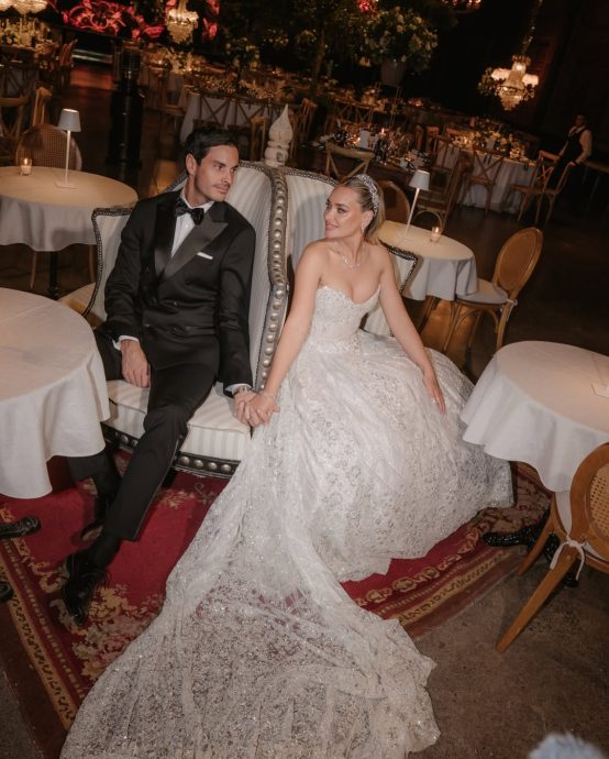 Por su parte, el novio optó por un traje negro de líneas impecables, logrando una imagen sobria y acorde al tono de la ceremonia. Ambos protagonizaron diversas postales románticas que rápidamente comenzaron a circular en redes sociales.