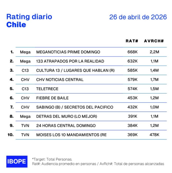 Rating TV chilena: los programas más vistos del día domingo 26 de abril