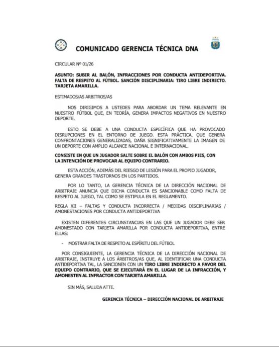 La Asociación del Fútbol Argentino, a través de la Gerencia Técnica de la Dirección Nacional de Arbitraje, anunció una nueva medida reglamentaria que ya está generando debate en el fútbol trasandino. La disposición busca sancionar una acción específica que, según el organismo, afecta el desarrollo del juego y su imagen.