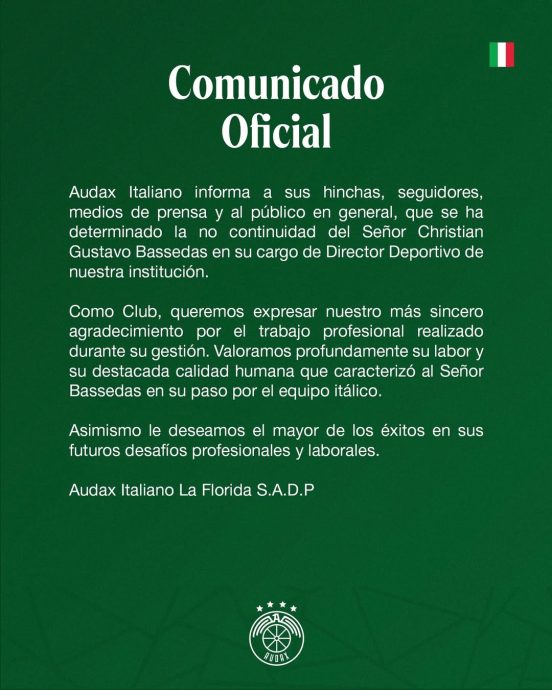 «Audax Italiano informa a sus hinchas, seguidores, medios de prensa y al público en general, que se ha determinado la no continuidad del señor Christian Gustavo Bassedas en su cargo de Director Deportivo de nuestra institución», señalaron desde la institución.