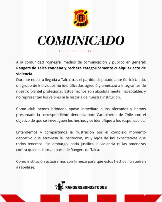 El club de Talca se refirió a los hechos mediante un breve comunicado: «Entendemos y compartimos la frustración por el complejo momento deportivo que atraviesa la institución, muy lejos de las expectativas que todos tenemos. Sin embargo, nada justifica la violencia ni las amenazas», señalaron desde la directiva.