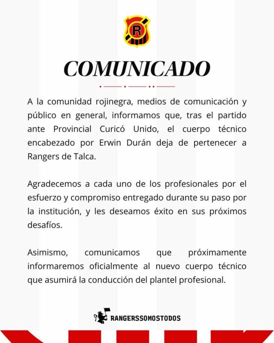 Pero los problemas para Rangers no quedaron allí. La directiva del club decidió, pasada la medianoche, despedir a Erwin Durán, convirtiéndose en el primer técnico removido en lo que va de la temporada en la Primera B.