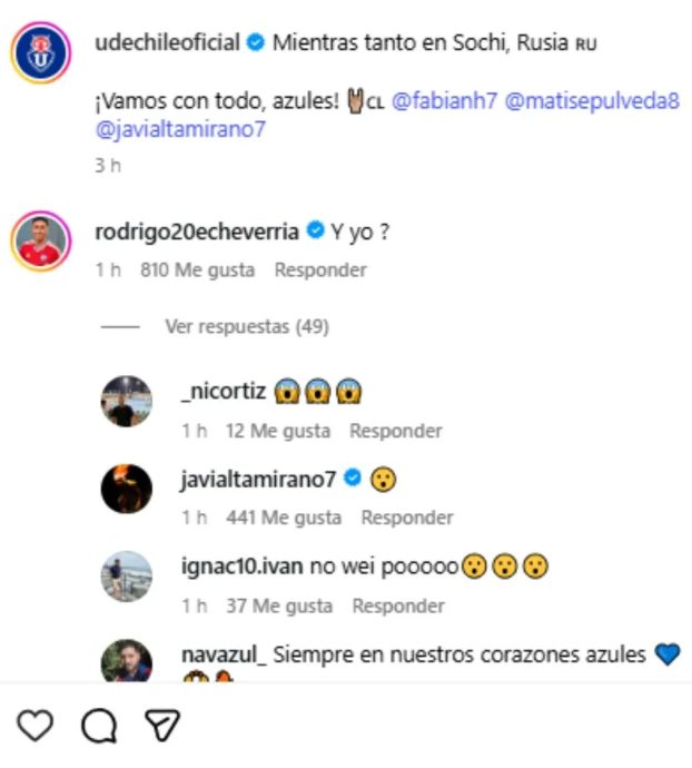 Todo ocurrió a través de Instagram, cuando la cuenta oficial de Universidad de Chile destacó a sus jugadores seleccionados nacionales que se preparan para enfrentar a Rusia en Sochi. La publicación recibió una respuesta enigmática de Echeverría: «¿Y yo?», escribió el jugador del León de México, dejando entrever un posible acercamiento con el club universitario de cara al próximo mercado de fichajes.