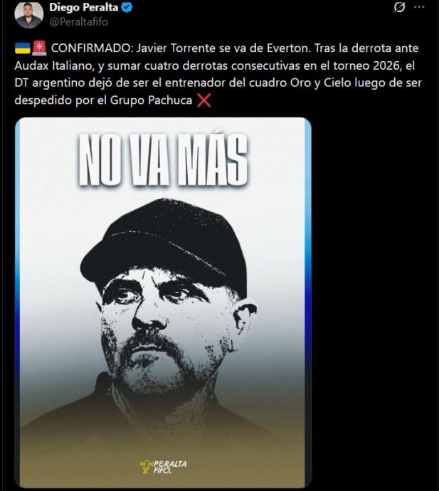 La noticia fue adelantada por el periodista Diego Peralta a través de su cuenta en X, donde informó: «CONFIRMADO: Javier Torrente se va de Everton. Tras la derrota ante Audax Italiano, y sumar cuatro derrotas consecutivas en torneo 2026, el DT argentino dejó de ser el entrenador del cuadro Oro y Cielo».