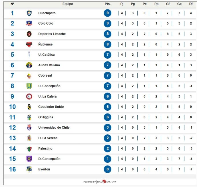 En la parte baja de la tabla, Everton de Viña del Mar continúa sin sumar unidades y aún no ha convertido goles en la temporada. Mientras tanto, Universidad de Chile se mantiene en la posición 12, con apenas 3 puntos tras cuatro jornadas disputadas.