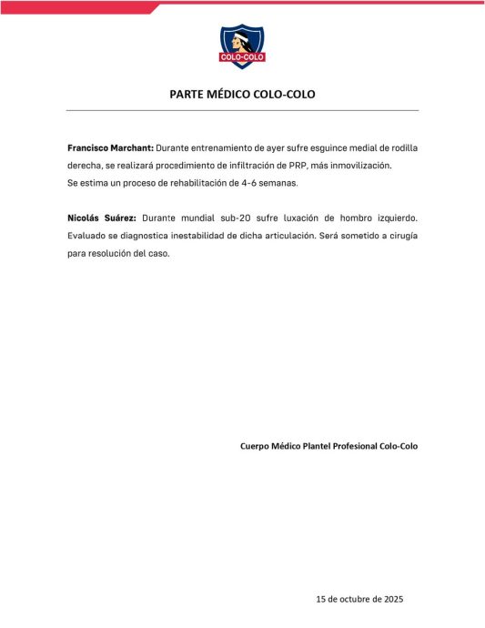 Desde Colo Colo emitieron un comunicado oficial detallando la situación de Marchant. Según el club, el delantero se someterá a un procedimiento de infiltración de PRP, seguido de inmovilización. Se espera que su proceso de rehabilitación dure entre cuatro y seis semanas, por lo que estará poco más de un mes fuera de las canchas.