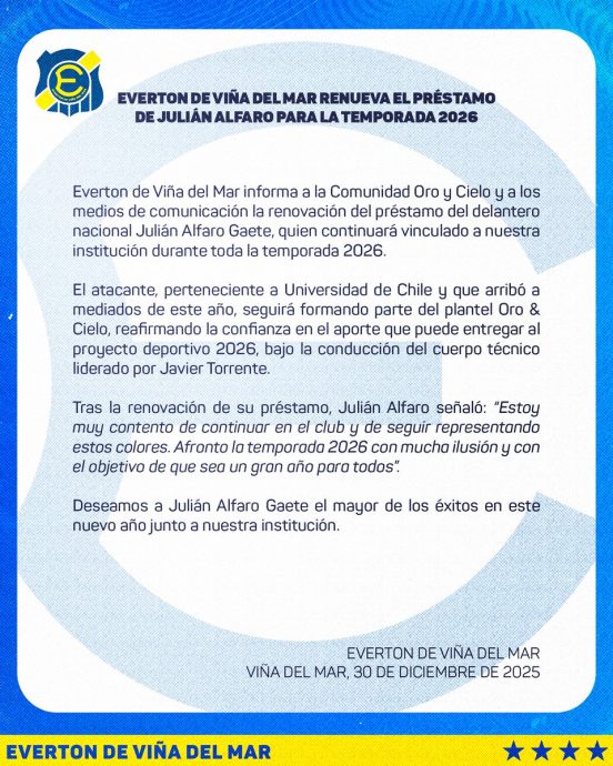 Por su parte, Julián Alfaro expresó su entusiasmo por continuar en Everton: «Estoy muy contento de seguir en el club y de representar estos colores. Afronto la temporada 2026 con mucha ilusión y con el objetivo de que sea un gran año para todos».