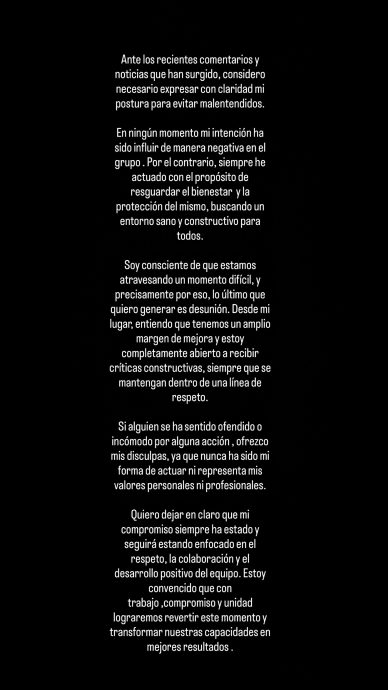 En su mensaje, el defensor agregó que en ningún momento tuvo la intención de generar un conflicto dentro del grupo o afectar la relación con la hinchada.