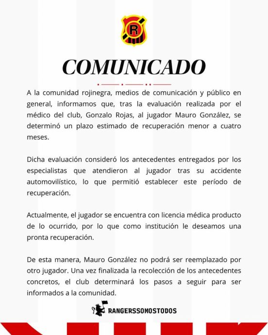 «Tras la evaluación realizada por el médico del club, Gonzalo Rojas, al jugador Mauro González, se determinó un plazo estimado de recuperación menor a cuatro meses», indicaron desde Rangers.
