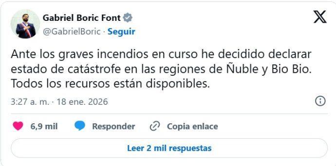 «Ante los graves incendios en curso he decidido declarar estado de catástrofe en las regiones de Ñuble y Biobío. Todos los recursos están disponibles», comunicó el mandatario a través de su cuenta de X.