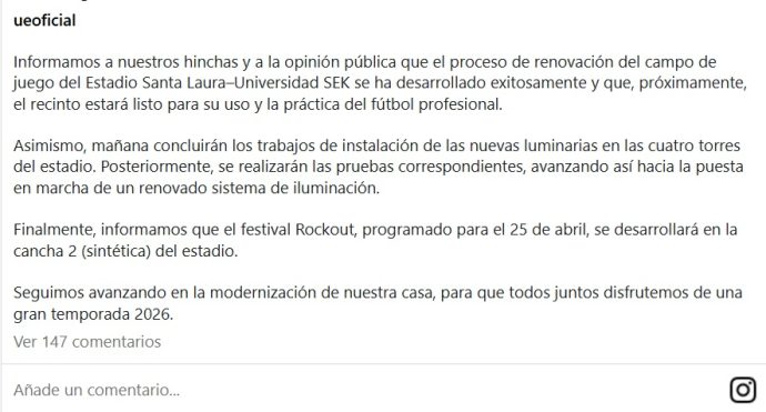 En su comunicado, el club indicó: «Informamos a nuestros hinchas y a la opinión pública que el proceso de renovación del campo de juego del Estadio Santa Laura–Universidad SEK se ha desarrollado exitosamente y que, próximamente, el recinto estará listo para su uso y la práctica del fútbol profesional».